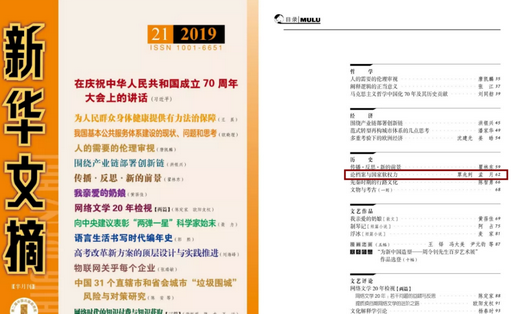 2019年第21期《新华文摘》全文转载了全国档案专家暨档案学理论研究领军人才、我校历史文化学院覃兆刿教授和其指导的研究生孟月(现湖南师范大学工作)共同署名的文章《论档案与国家软权力》。原文发表于《档案学研究》2019年第3期,此前被中国人民大学复印资料《档案学》2019年第5期全文转载。